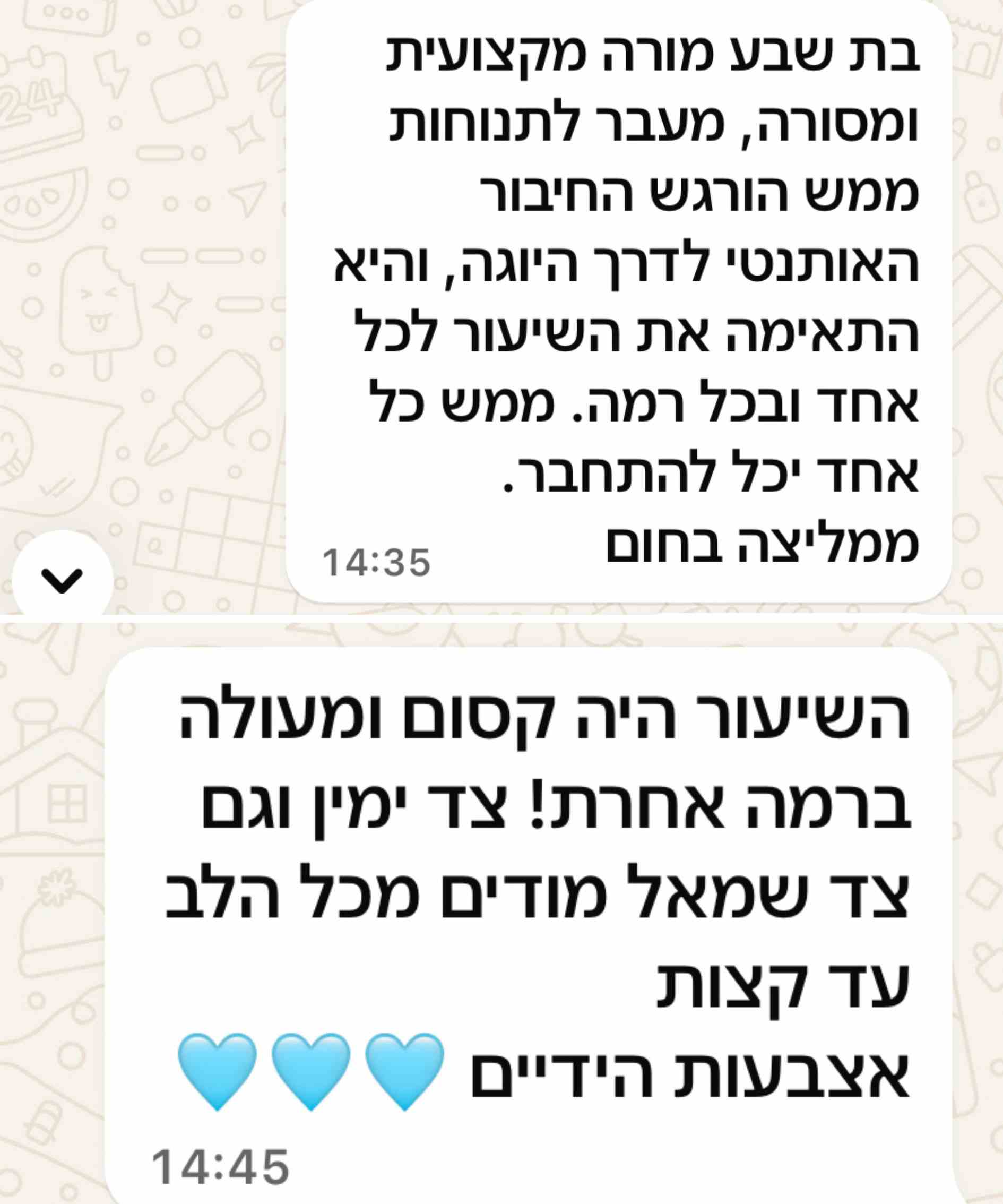 בהודו נכנסתי במקרה לשיעור יוגה והתאהבתי. לא היה שם שיפוט ולא היו מראות. רק תנועה פשוטה, חופשית. תנועה שטובה מספיק כפי שהיא, ואין חשיבות למראה שלה. אחרי השיעור הרגשתי צלולה, נוכחת ורגועה, תחושות שגרמו לי להתמיד ולהעמיק בתרגול. משם צמח הרצון להעביר את החוויה שלי הלאה.