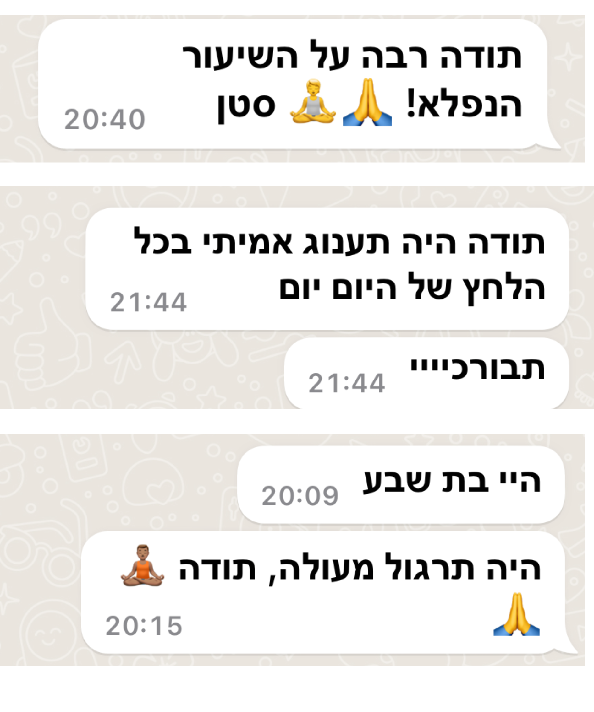 אני משלבת יוגה בחיי היומיום ומרגישה את השפעתה, בין היתר, על שחרור לחצים ומתחים, על הקלת הנשימה, על הפחתת כאבים ועייפות, על נוכחות בכאן ובעכשיו, על שיווי המשקל והיציבה ועל חיזוק הגוף. גם תלמידיי מספרים לי שהם מרגישים כך.