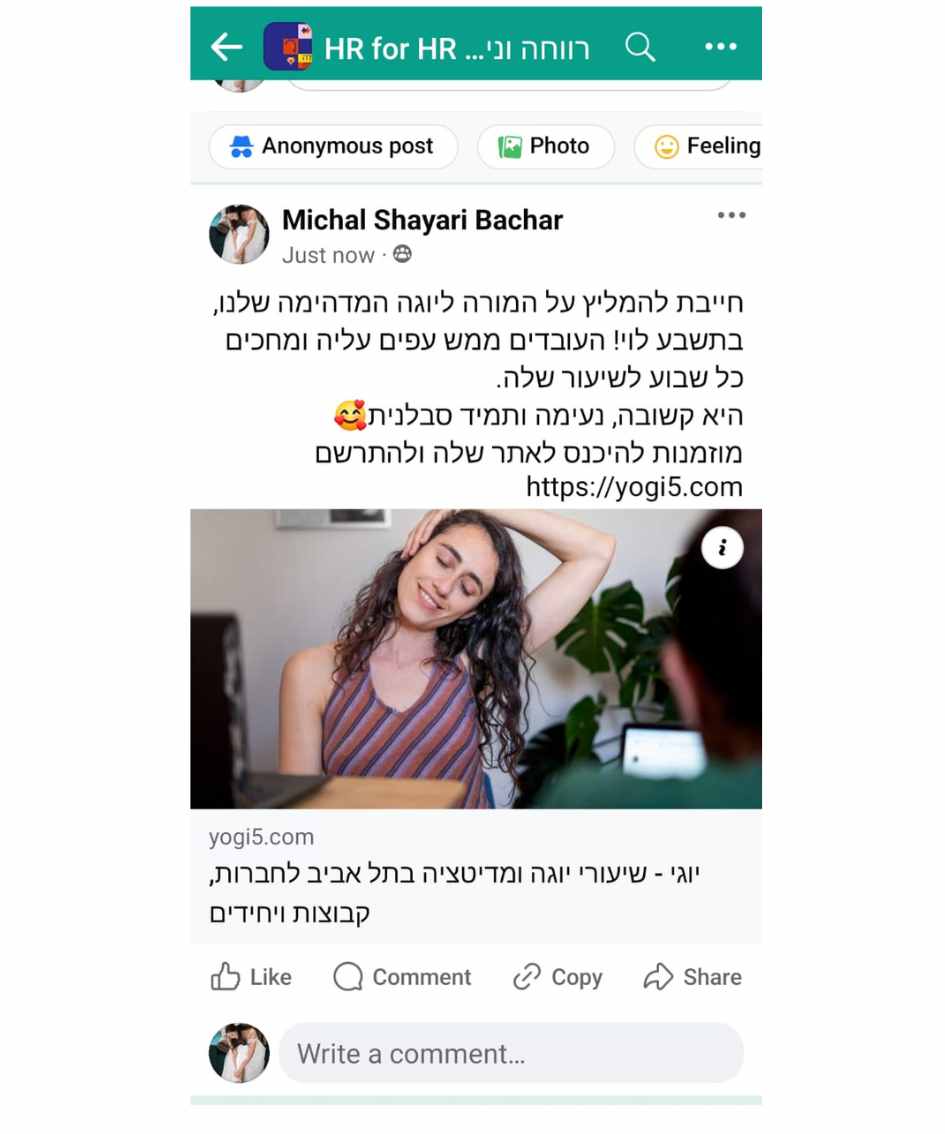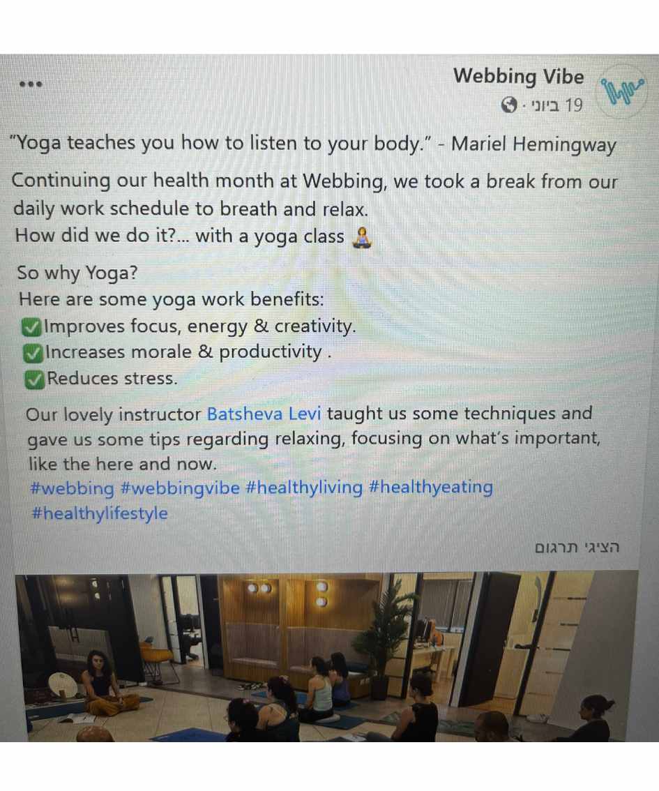 בשיעורים שאני מעבירה בחברות ובארגונים וללקוחותיי הפרטיים אני מדגימה, בין היתר, איך אפשר לשלב יוגה בעבודה במשרד ללא צורך במזרן וכיצד תרגילי נשימה פשוטים יכולים להוסיף איכות לחיים.